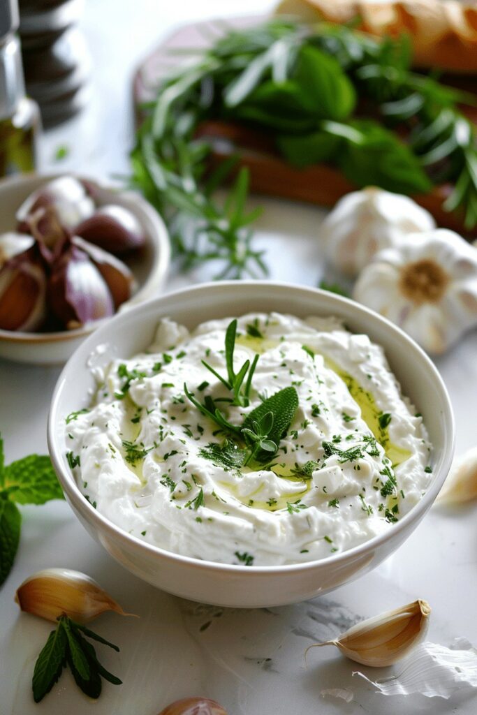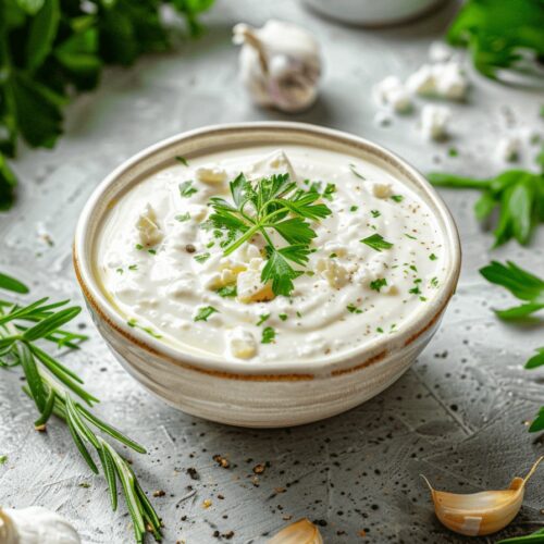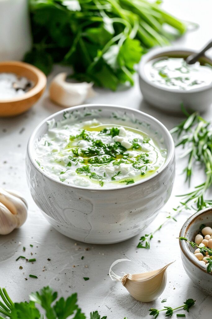 - Ajouter le yaourt grec, l’ail émincé, le jus de citron et les herbes fraîches.
