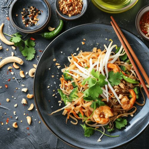 - Servir : Répartir le Pad Thaï dans des assiettes. Garnir de cacahuètes concassées, de coriandre fraîche et de quartiers de citron vert. Servir immédiatement.