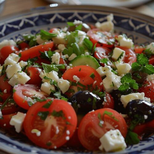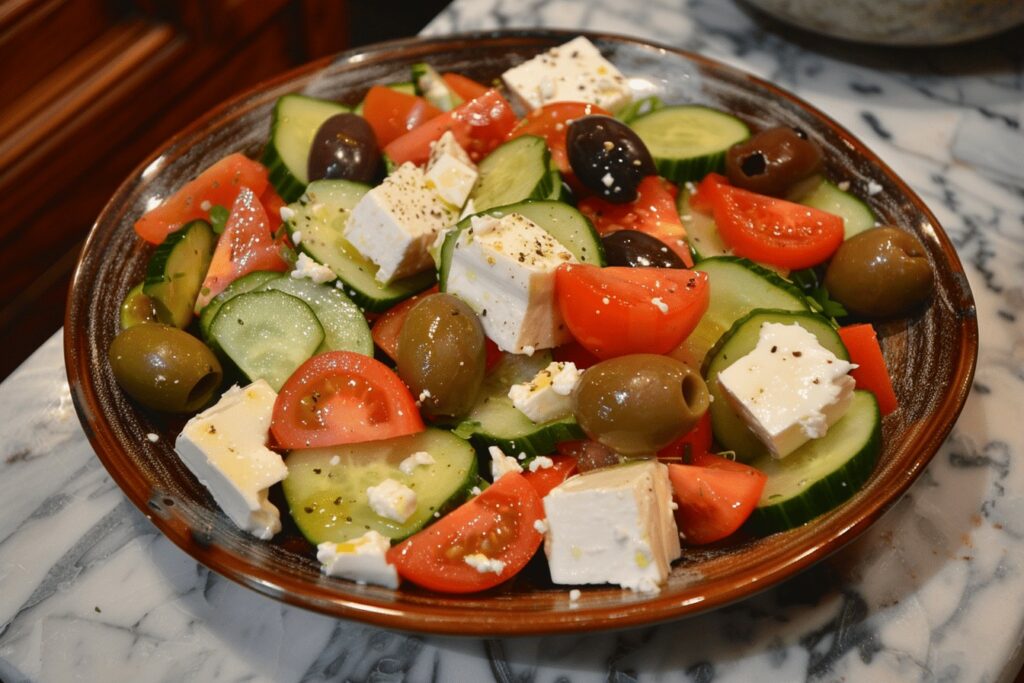 La salade grecque est un classique de la cuisine méditerranéenne, idéale pour un repas léger et rafraîchissant. Composée de tomates juteuses, de concombres croquants, d’olives savoureuses et de fromage feta, cette salade est à la fois simple et délicieuse. Parfaite en accompagnement ou en plat principal, elle apporte une touche de fraîcheur à vos repas.