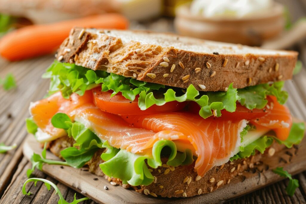 - Réalisez votre sandwich de saumon fumé (ou truite fumée) et fromage frais sans le toaster entre 2 tranches de pain multicéréales, 2 feuilles de salades vertes (Batavia ou feuille de chêne) et quelques rondelles de tomates