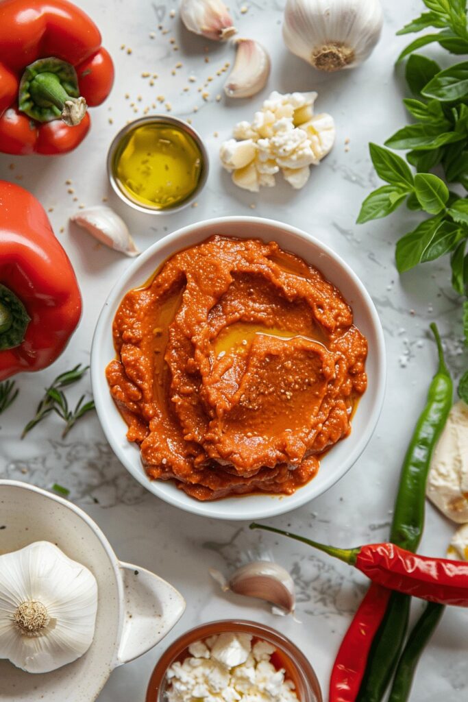 Quels ingrédients pour accompagner la sauce aux poivrons rouges grillés et Feta?