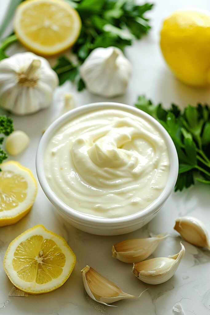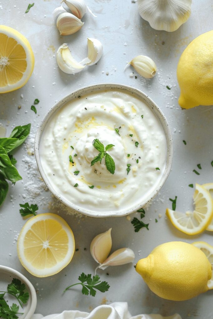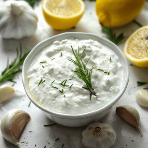 Avec des viandes : Utilisez cette sauce comme accompagnement pour des viandes grillées ou rôties. La saveur fraîche et crémeuse de l’ail complète bien le goût riche des viandes grillées.
